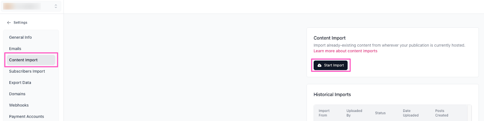 - Open the Content Import tool in beehiiv. From your beehiiv account, go to Settings > Content Import and click the Start Import button.