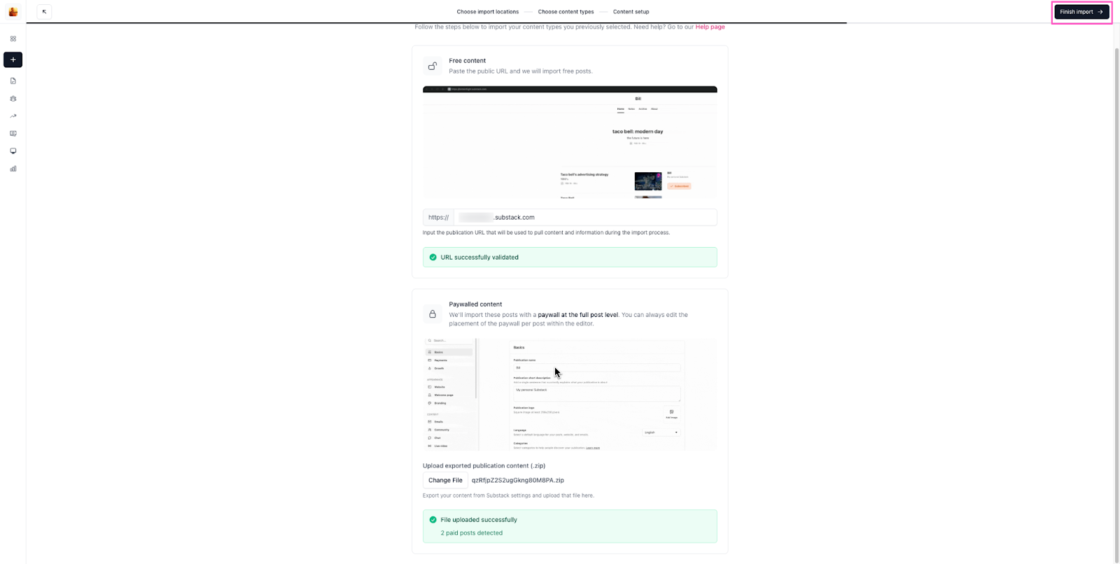 - After your Substack URL is validated and your file uploads successfully, click Finish import in the top-right corner.