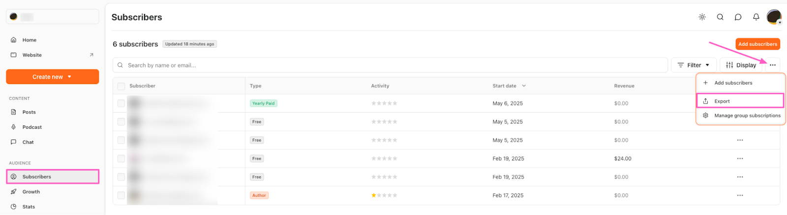 - Log in to your Substack account and go to Subscribers. Access the dropdown menu on the right and select to Export a CSV list of all your subscribers.