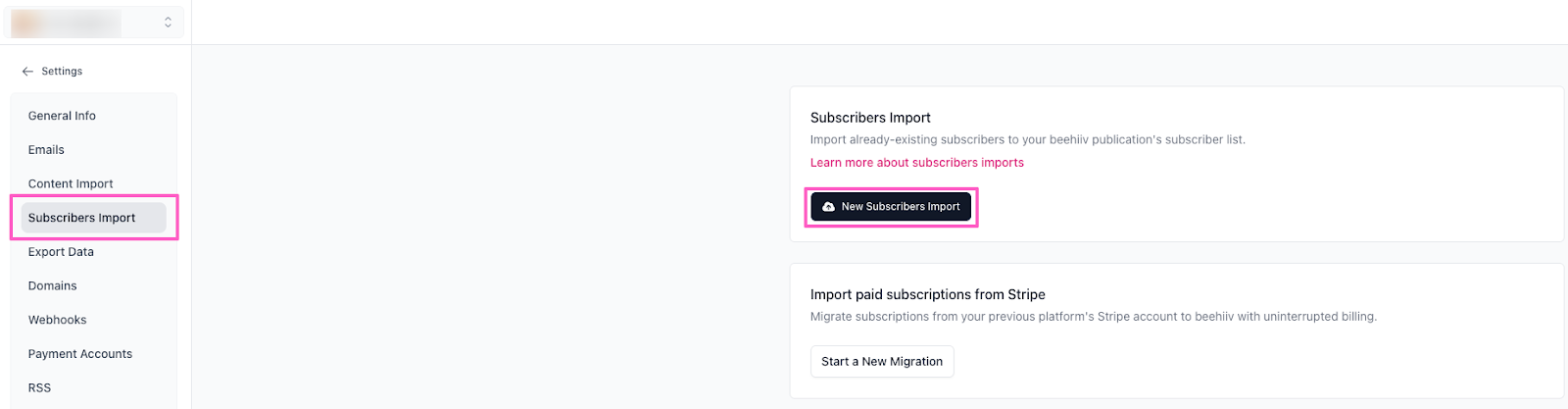 - In beehiiv, go to Settings > Subscribers Import and click the New Subscribers Import button.