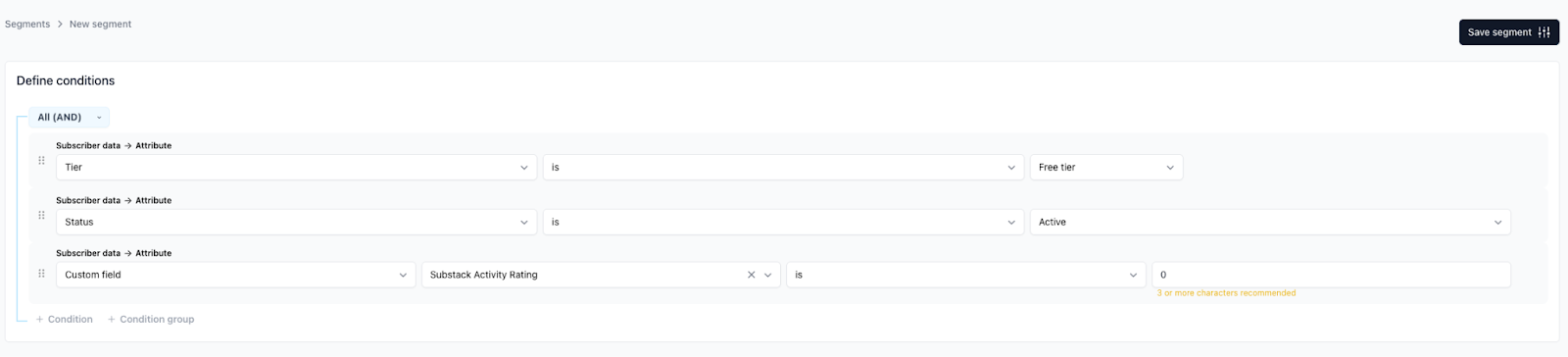 - If you’ve included the Substack Activity Rating custom field, we recommend excluding subscribers with an activity rating of 0 for your first 2-4 weeks of sending.