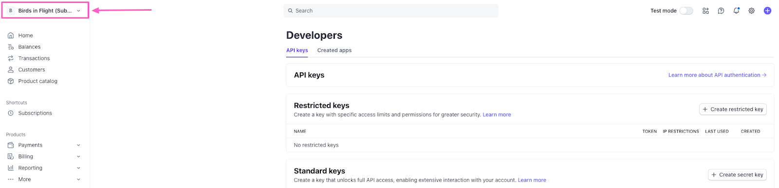 - Back in Stripe, navigate to Developers > API keys. Make sure that you’re still in your Substack-connected Stripe account.