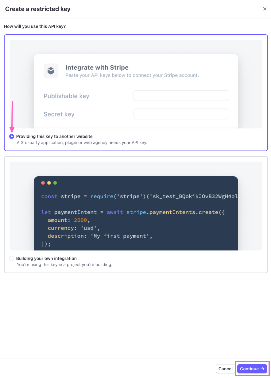 - When prompted, select Providing this key to another website, then click Continue at the bottom of the screen.