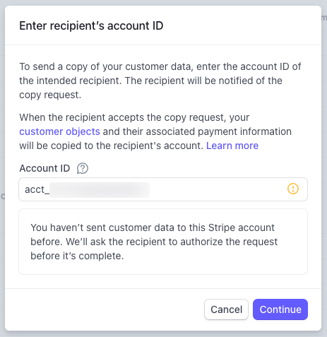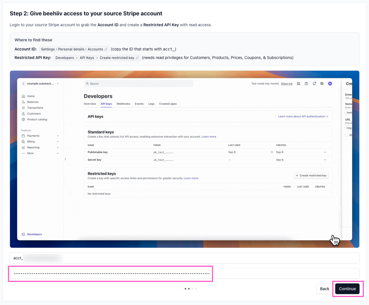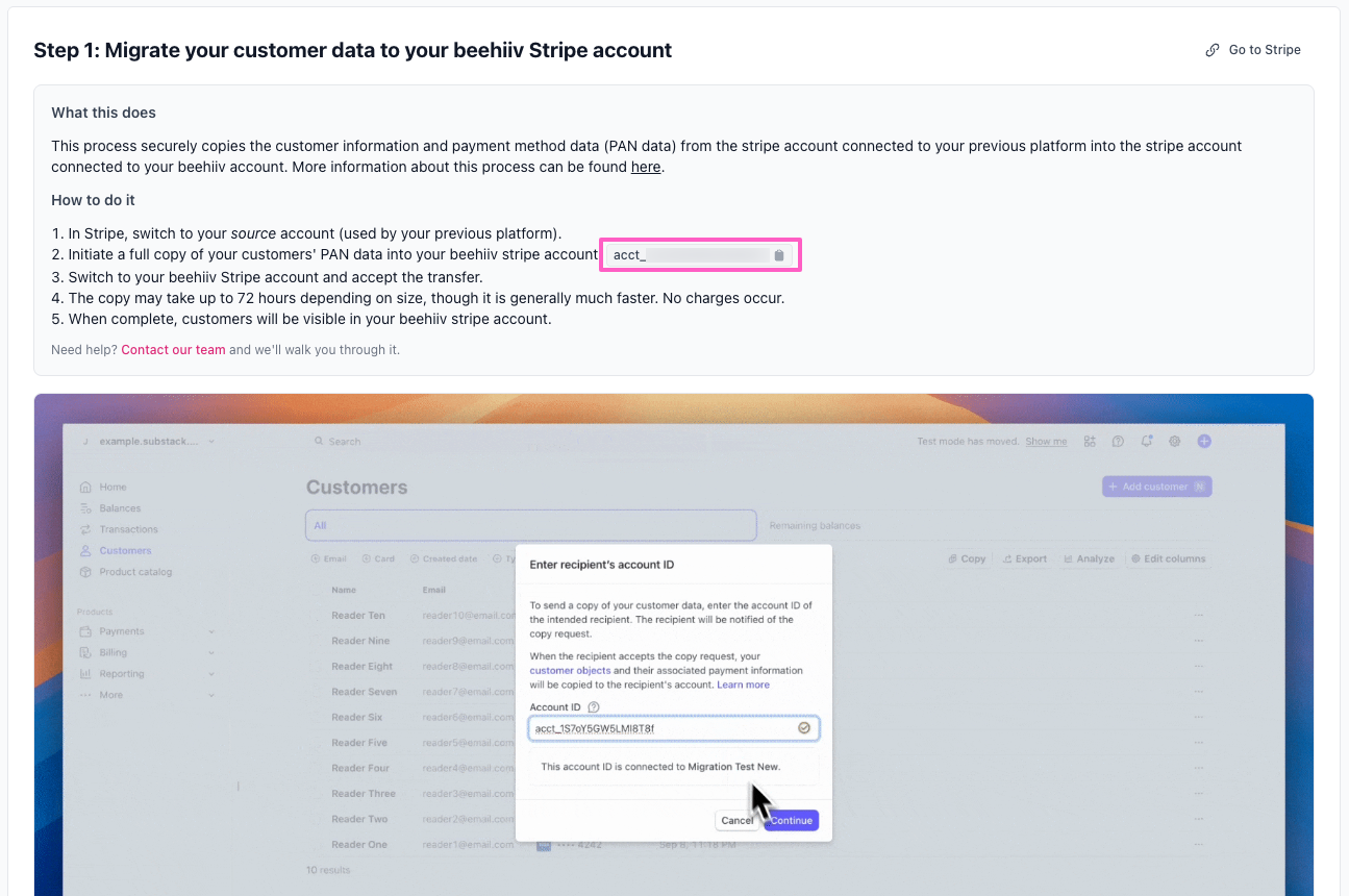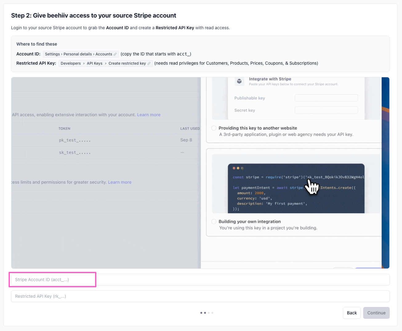 - Return back to Stripe, paste the beehiiv Stripe account ID into the Account ID field, and click Continue.