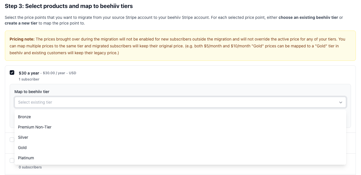 You can also map legacy price points to existing tiers or create new tiers to preserve older pricing for existing subscribers.- Select the checkbox for each tier or price point you want to migrate.