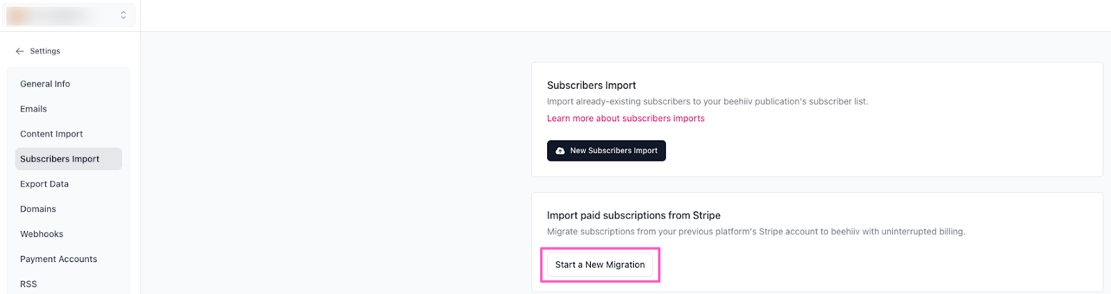 - In beehiiv, go to Settings > Subscribers Import. Under Import paid subscriptions from Stripe, click Start a New Migration.