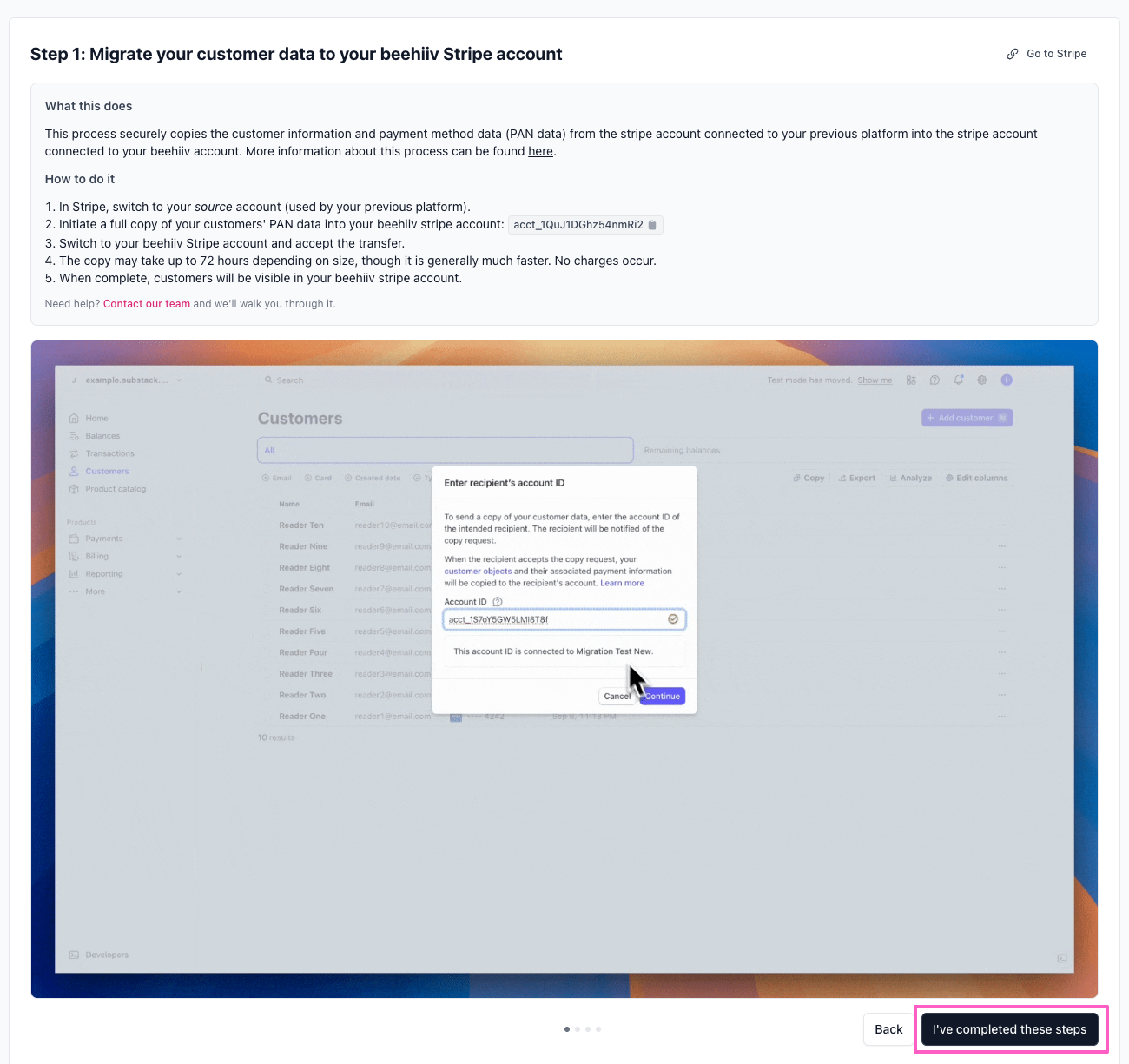 You’ll now see the customer profiles and payment details successfully copied into your beehiiv-connected Stripe account. - Next, the paid subscriptions will need to be recreated. Navigate back to your beehiiv tab and click the I’ve completed these steps button.