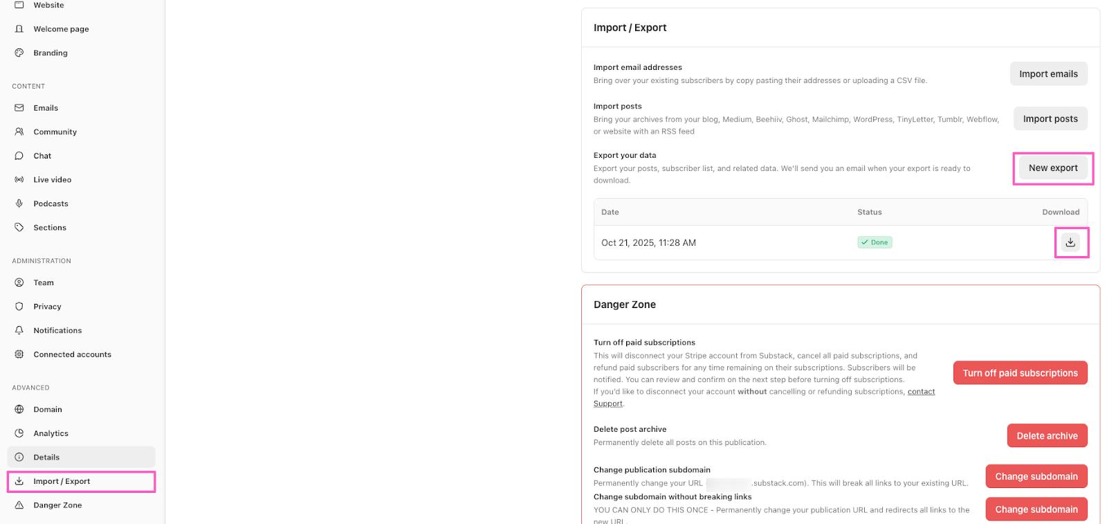 - From your Substack account, go to Dashboard > Settings > Import/Export. Click the New export button.