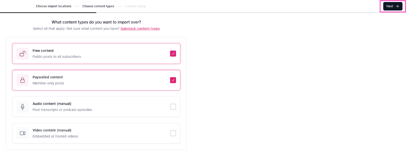 - Select your import source. Choose Substack and click Next in the top-right corner.