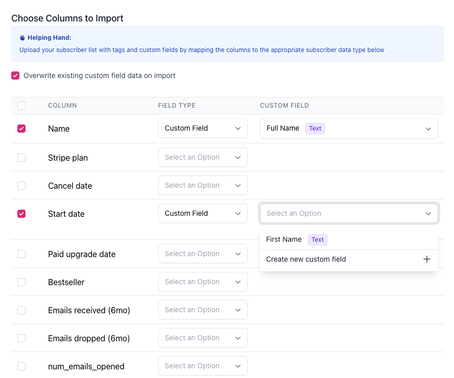 - Next, you’ll start mapping out the fields. Match the columns from your CSV file to fields in beehiiv. For any fields that don’t already exist, you can create new ones under the Custom Field column by selecting Create new custom field.