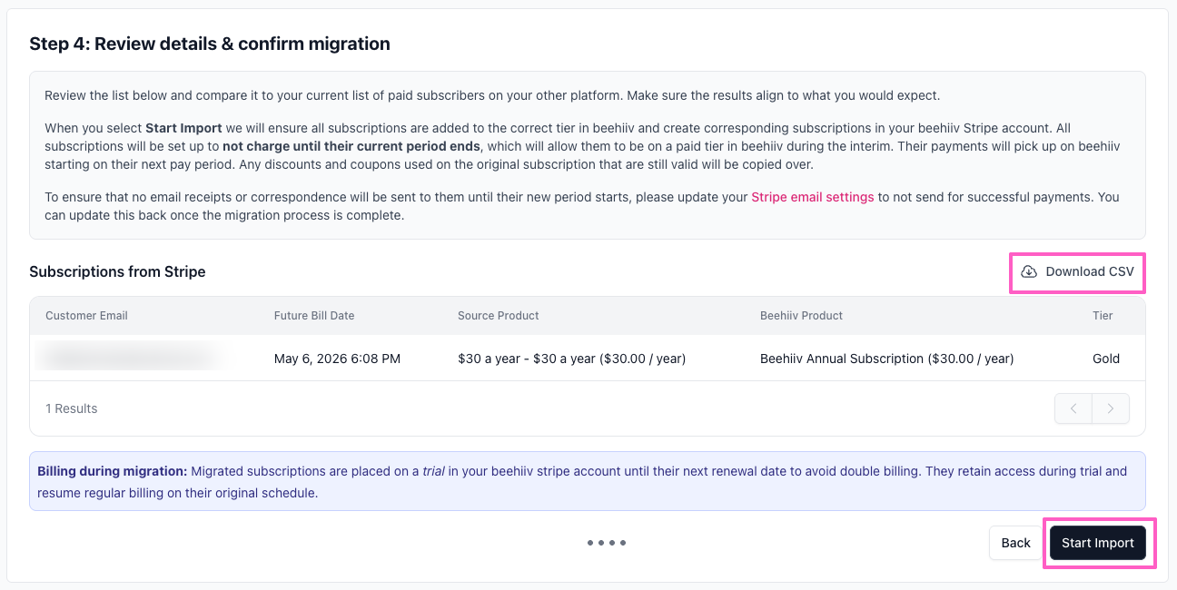 - When the migration completes, you’ll see a confirmation page showing which subscription products were successfully mapped to beehiiv.
