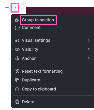 - Click the 6 dots icon to the left of any of the selected content blocks to access the menu and select Group to section.