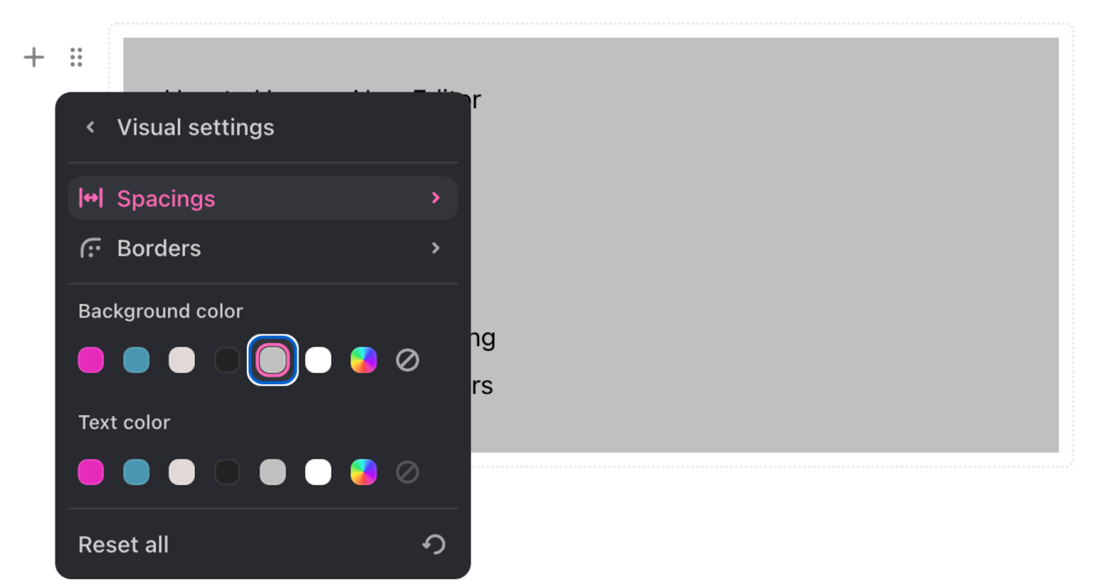 - The Visual settings will be revealed where you can customize the section’s Spacing, Border, Background color, and Text color. You can also click Reset all to revert the settings.