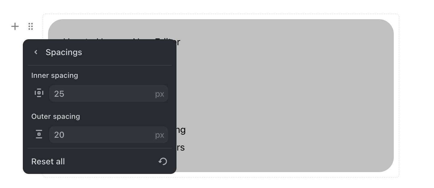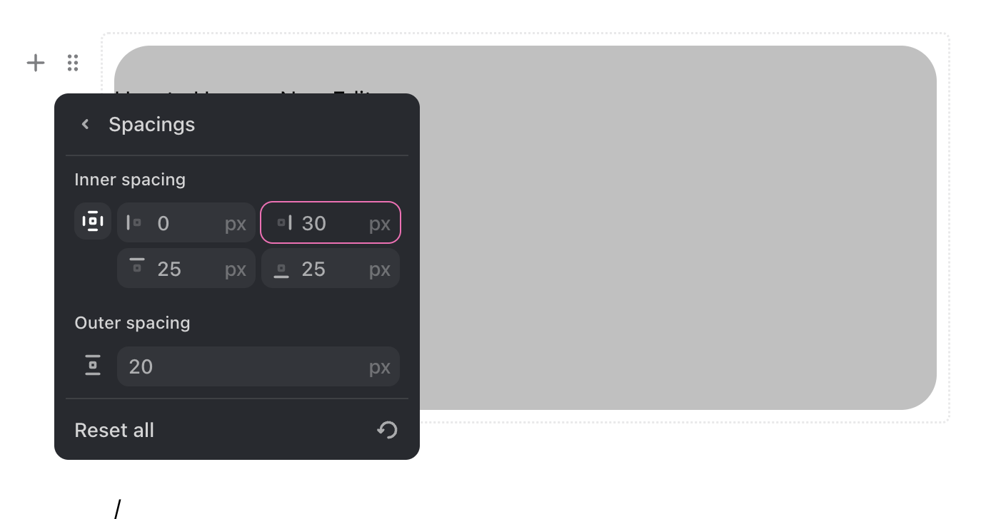 - Click on Spacings to customize the spacing of your border. You can also click Reset all to revert the settings.