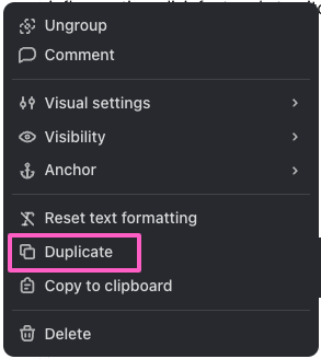 - Click the 6 dots icon to the left of a block or section to access the menu and select Duplicate. A copy of the block or section will appear below.