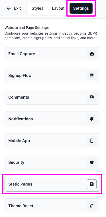 - The Website Builder will open on the Styles tab. Click on the Settings tab instead and then select Static Pages from the left panel.