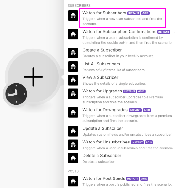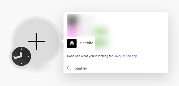 - You will first need to create the trigger for the webhook. For this example, the trigger will occur when a new beehiiv post is live. Click the + icon and select beehiiv as the trigger location.