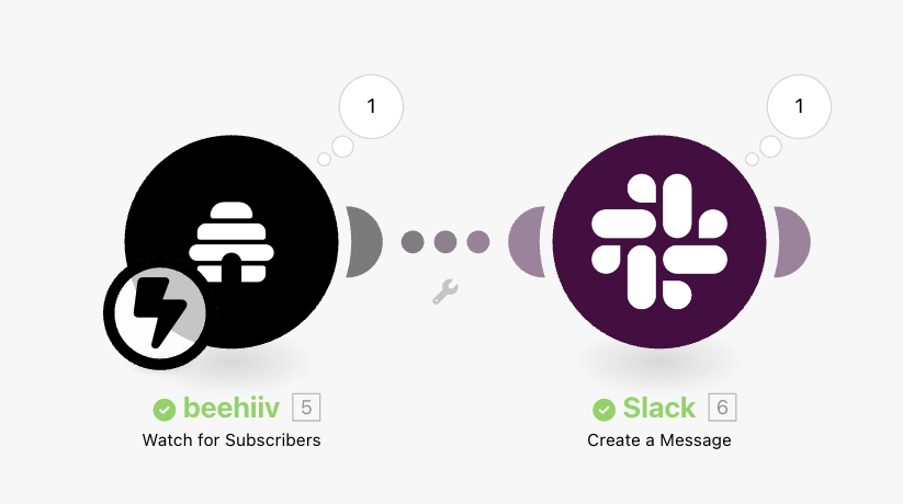 - After a short time, return to your Make account. You should see a number ‘1’ displayed on top of each scenario, indicating one new subscriber and one Slack message sent.