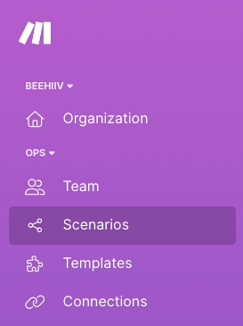 - Log into your Make account. Navigate to Scenarios and then click Create a New Scenario in the top right corner.