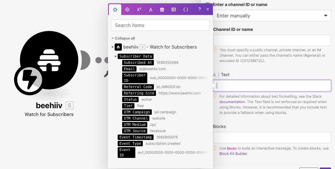 Now, we’ll set up what happens after a new subscriber triggers the webhook to create a Slack message.