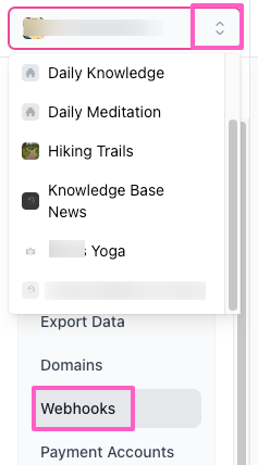 - Log into your beehiiv account and scroll down to Settings from the left panel dashboard. At the top of the Settings panel, ensure you're in the correct publication, then click Webhooks.