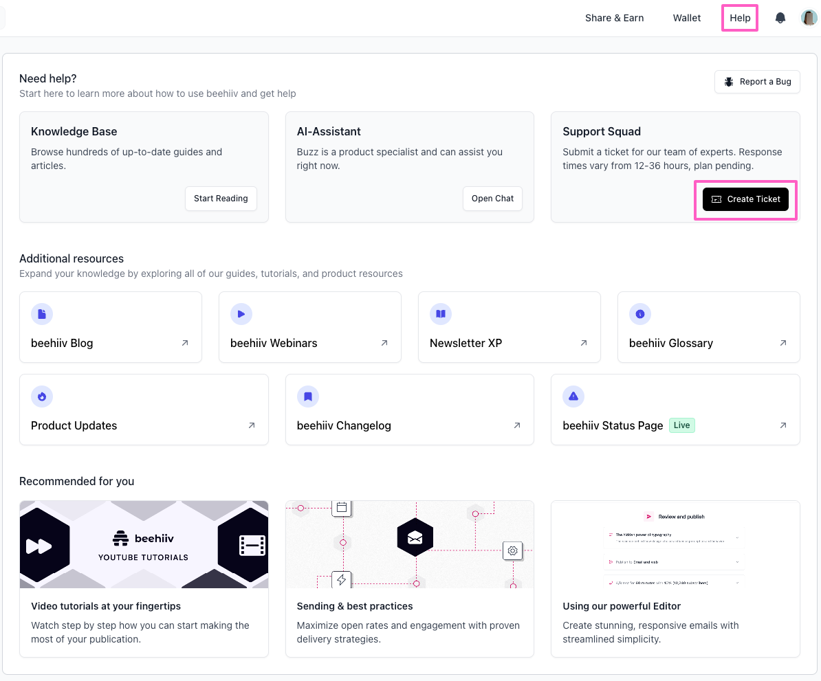 - Click on Create support ticket to submit your request. Shortly after, you’ll receive a confirmation email to your beehiiv account address.