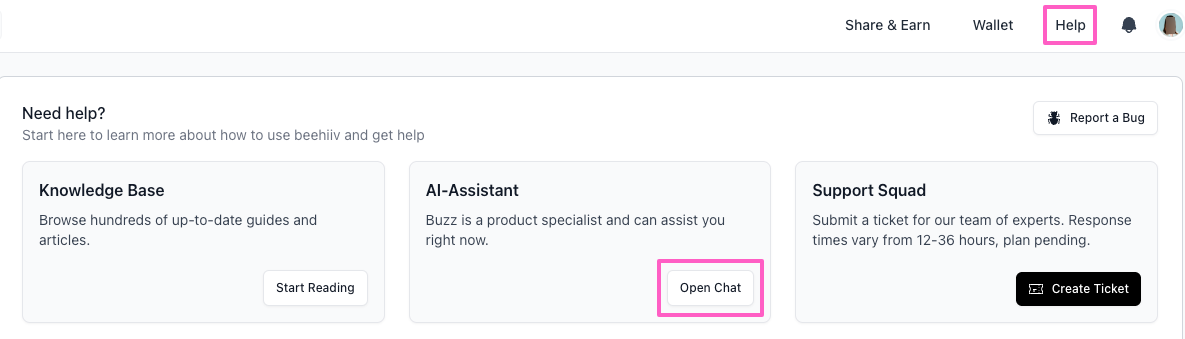 As a beehiiv customer, you can easily submit a support ticket directly from your account. For a more guided experience, use our chatbot, Buzz, available in your account and here in our Knowledge Base (KB) day or night.