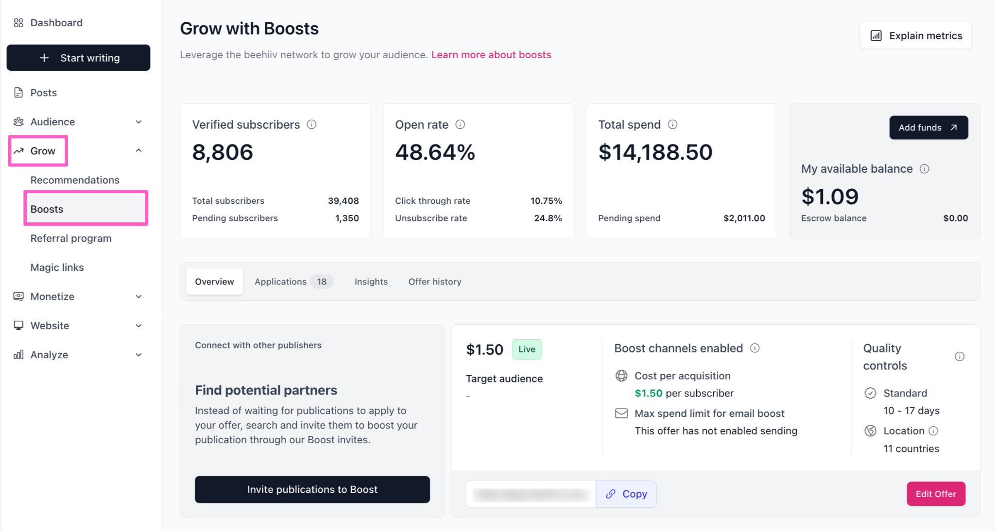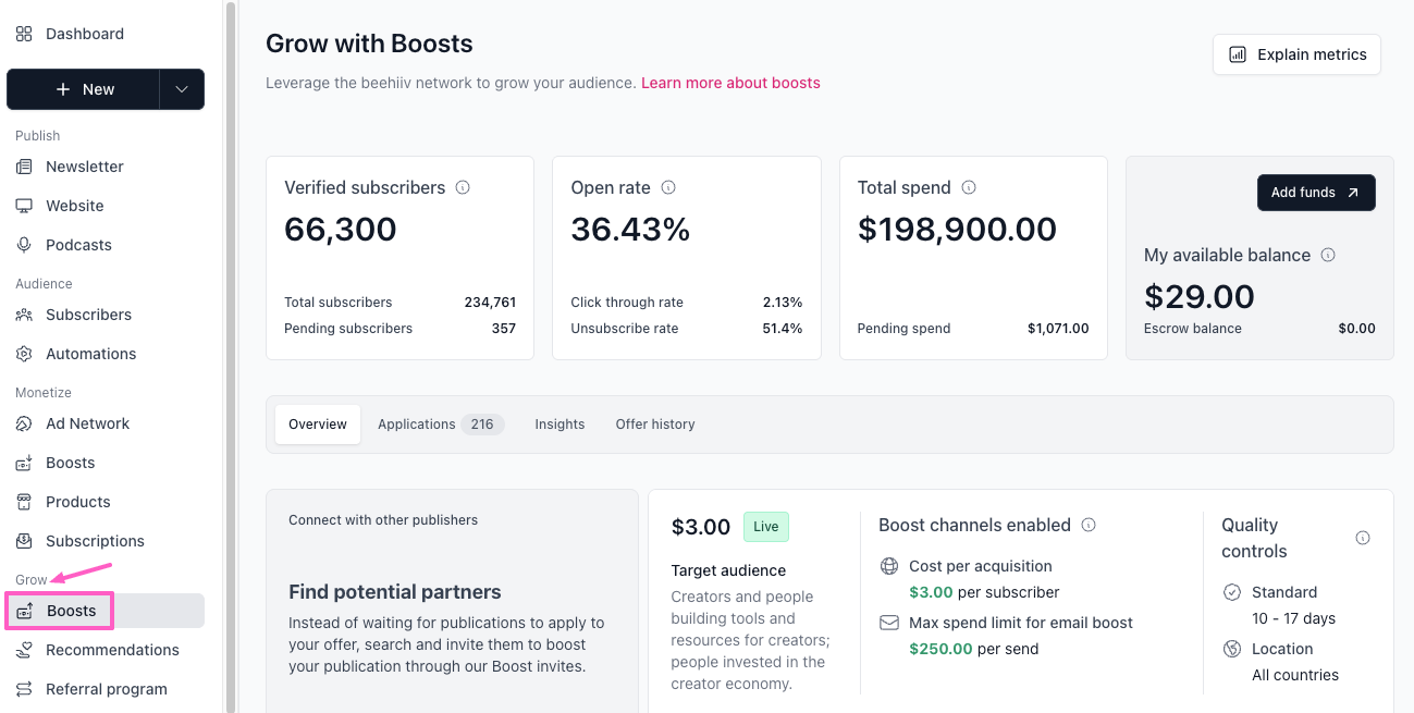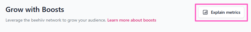 When using Grow Boosts, you’re paying for verified subscribers referred to your newsletter. To help you track and optimize your acquisition strategy, beehiiv provides a comprehensive dashboard with key insights and performance metrics for each publication you partner with — allowing you to make the most of your budget.