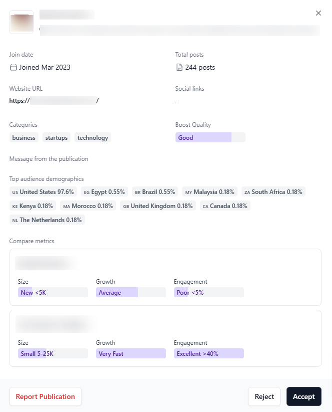 Click the name of any publication to go to their website. Click on the application to open a modal specific to that publication, where you can hone in on the publication’s details and compare the metrics of the publication against your own to determine if your potential partnership would be a good fit.