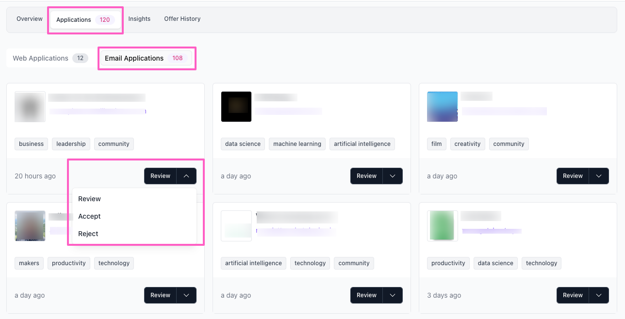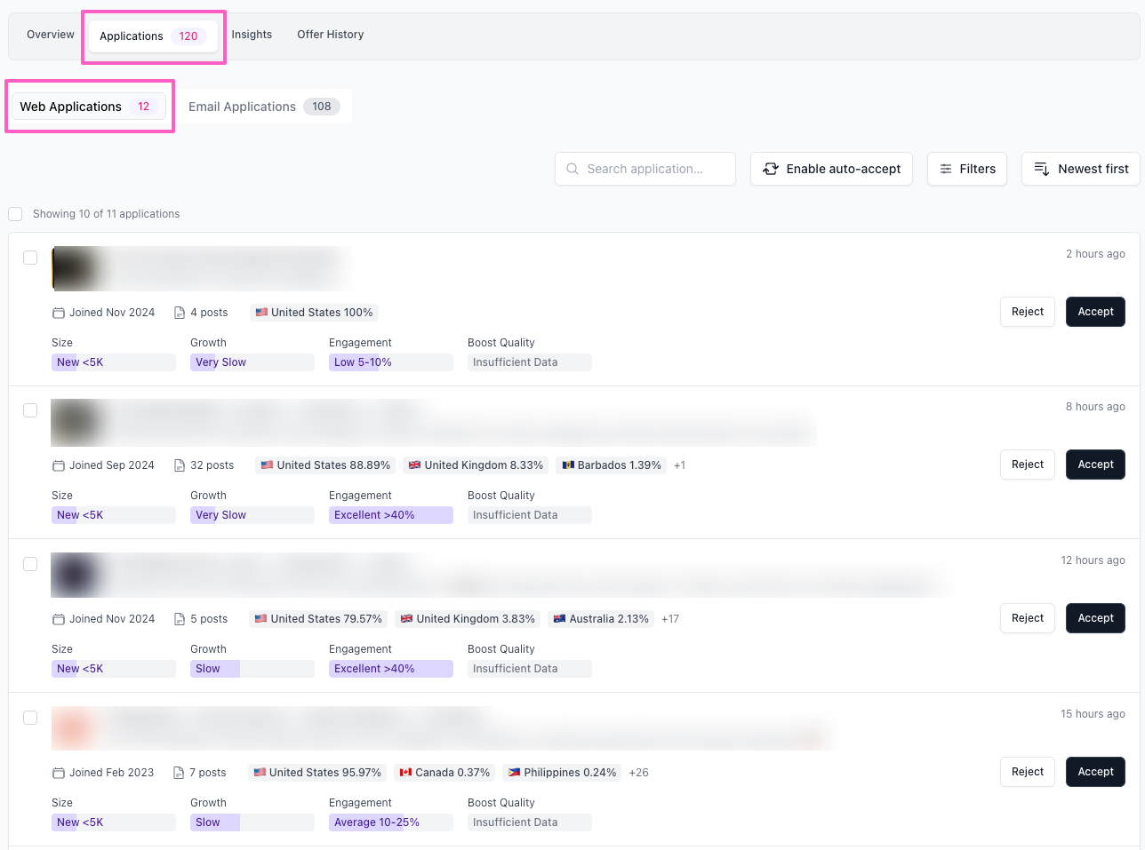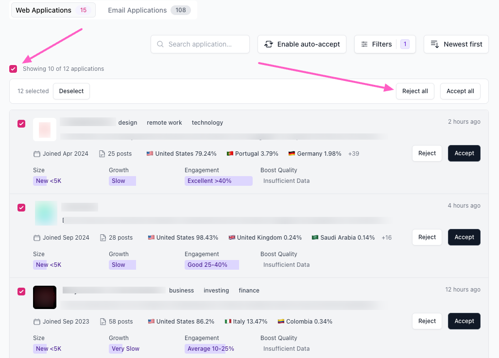 For example, if you consistently reject publications with less than 100 posts, simply set the ‘Number of posts’ filter to ‘less than’ > ‘100’ and reject all applications that meet this criterion in one action.