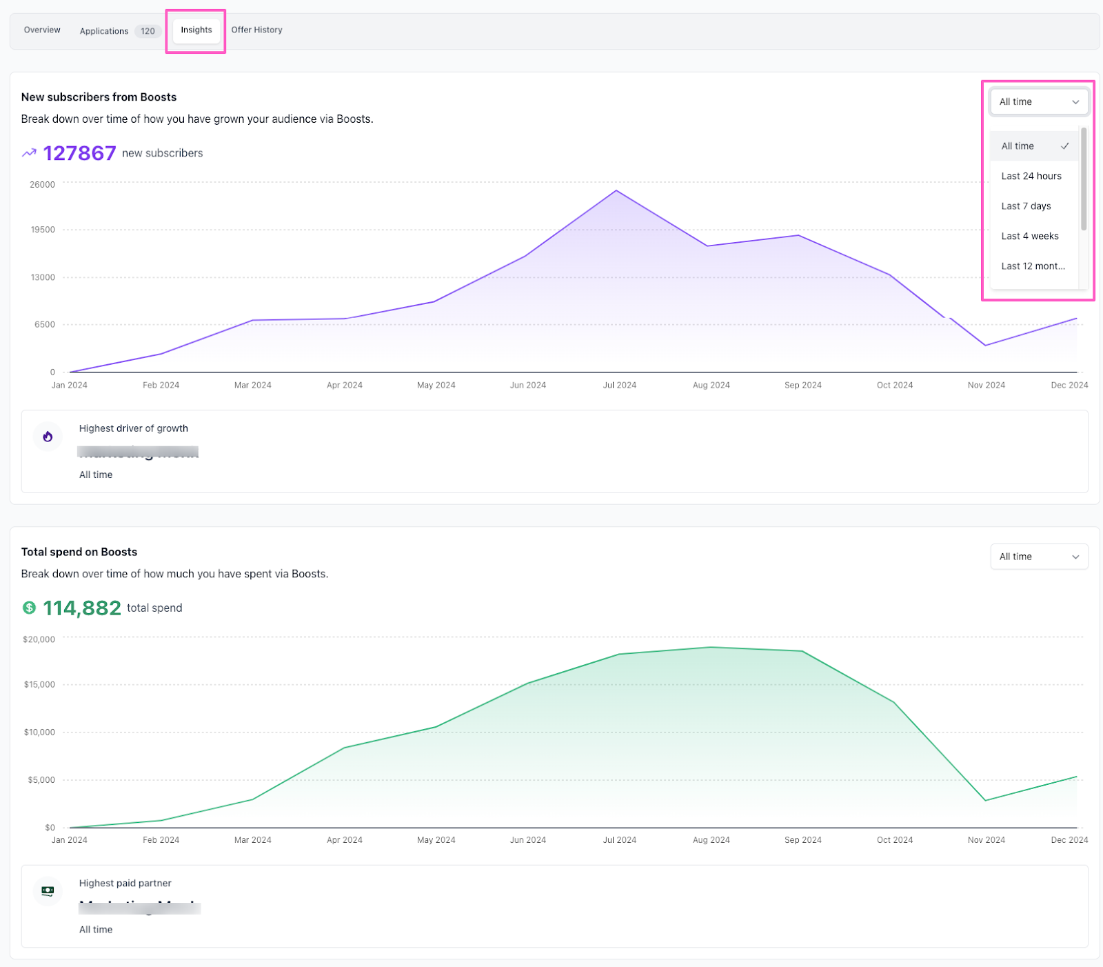 The Insights tab is dedicated to showing you macro trends with respect to subscriber growth and total spend across all of your Boosts. Each chart also shows the highest paid partner or driver of growth for the selected time period.