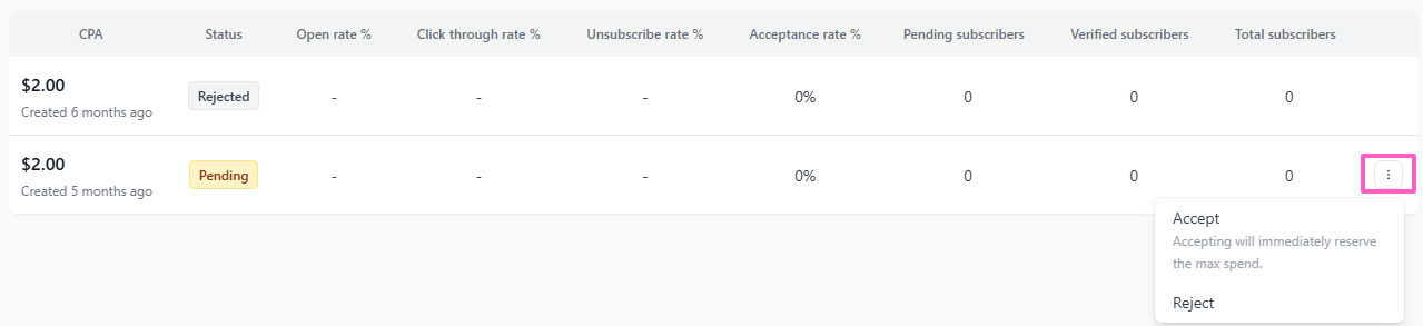 Email: The Email tab provides insights into the funds spent on your partner boosting your publication via email. If the publication has a boost that is currently Pending, click the 3 dots menu for the option to Accept or Reject the Boost application.