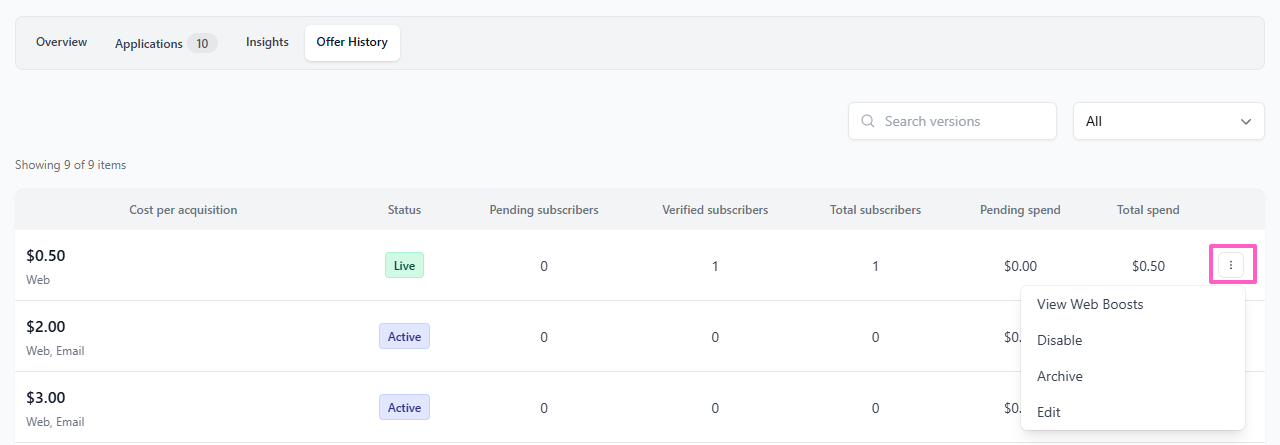 The Offer History tab allows you to track and compare the historical performance of your boost, factoring in when you update and change your CPA over time. Click the 3 dots menu to reveal options to View Web Boosts, View Email Boosts (if enabled), Disable, Archive, or Edit an offer (read on for details of these)