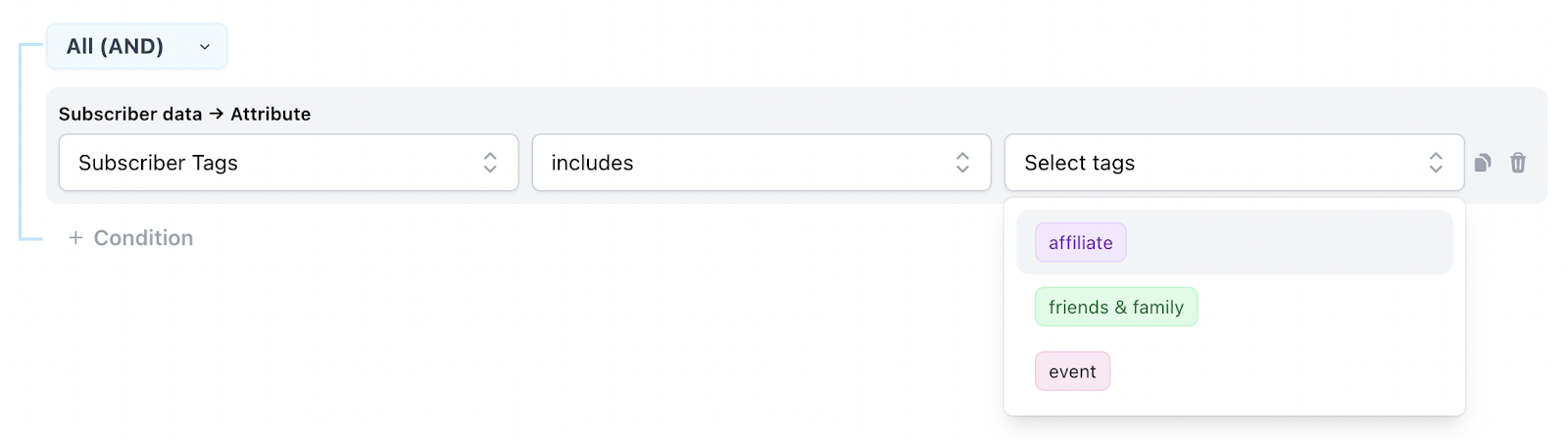 - You can also filter your subscriber data by tag within a segment using the condition for Attribute > Subscriber Tags.