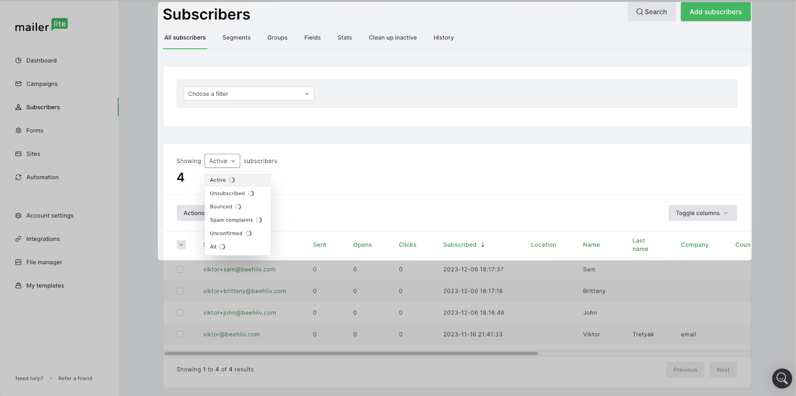 You can export all subscribers or choose specific subscriber categories, including active, unsubscribed, bounced, unconfirmed, and those who have sent spam complaints.Pro Tip: We highly recommend only migrating your active subscribers to beehiiv. To view this specific list in your MailerLite account, select to show Active subscribers from the dropdown menu. - After you select the subscribers you wish to export, you can select subscribers individually or click on the dropdown arrow next to the Subscriber column to select all subscribers that are visible on the current page or all of the subscribers in the list.