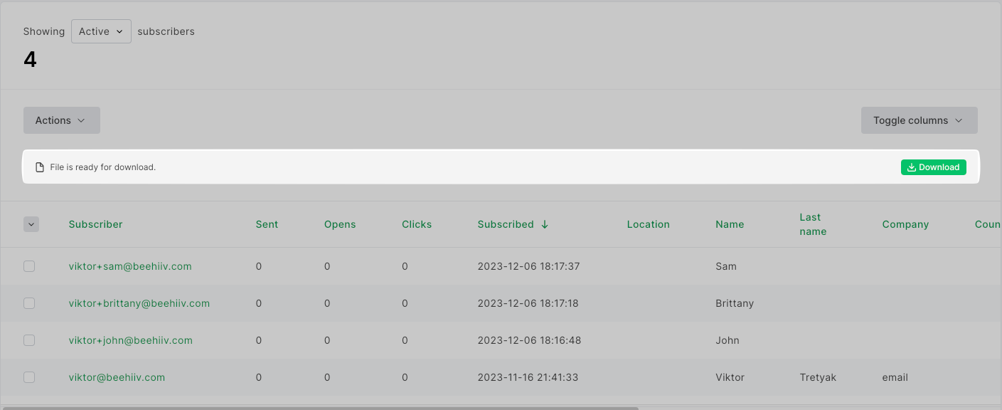 Tech Note: The export function only exports the columns/fields that are visible on your subscriber list overview at the moment of exporting. By default, the first few columns will always be included. To select additional columns /fields in your export file, you’ll need to click on the Toggle columns dropdown option to see the full list. - Head back to the Actions dropdown option and select Export CS.