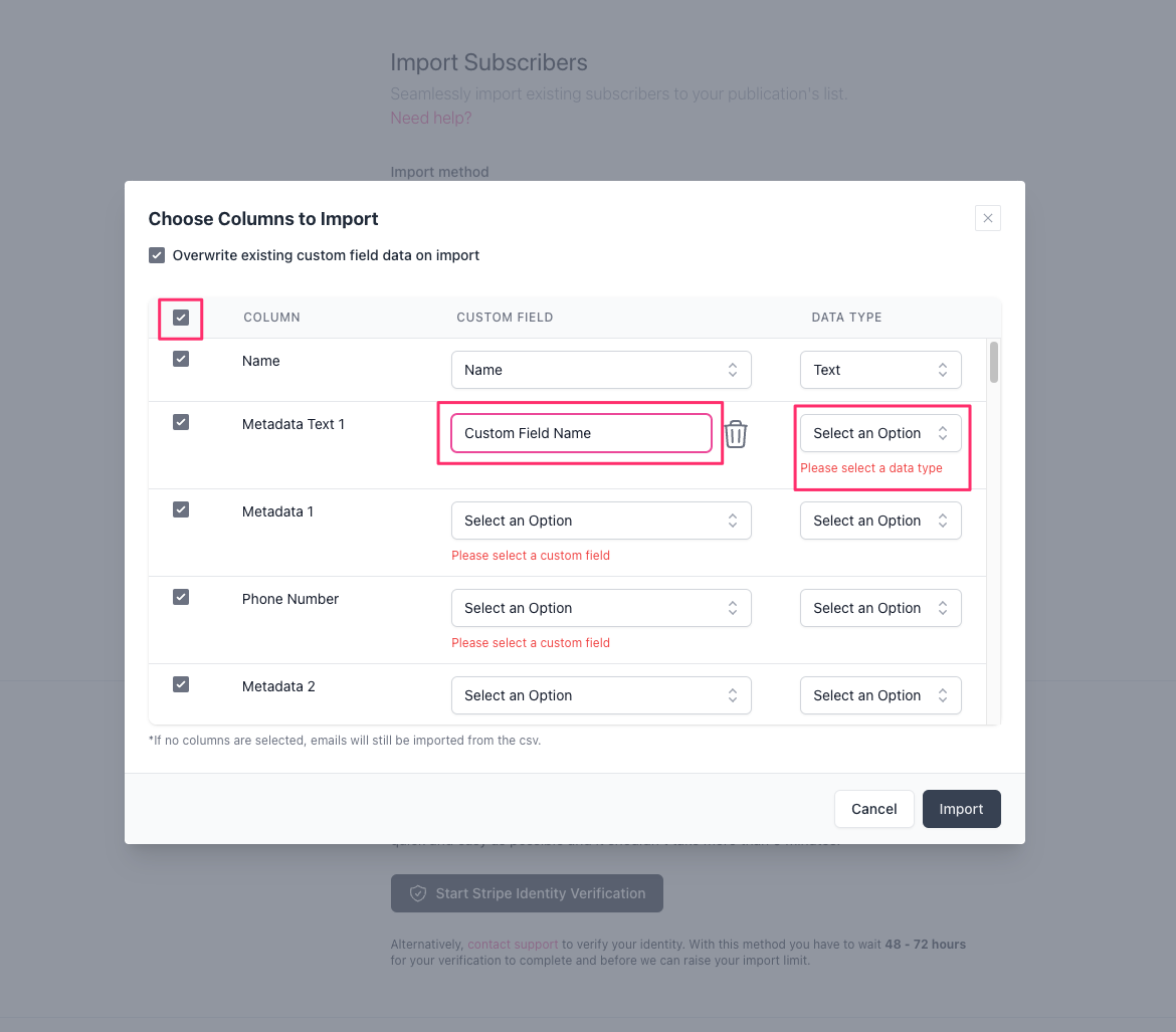 - Next, you’ll be able to start mapping out the fields (tags) from the CSV file as custom fields within beehiiv.