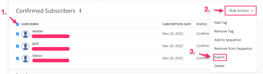 Note: If you have over 30 subscribers to select, make sure you also click the confirmation link in the blue bar that pops up. - Click Bulk Actions > Export.