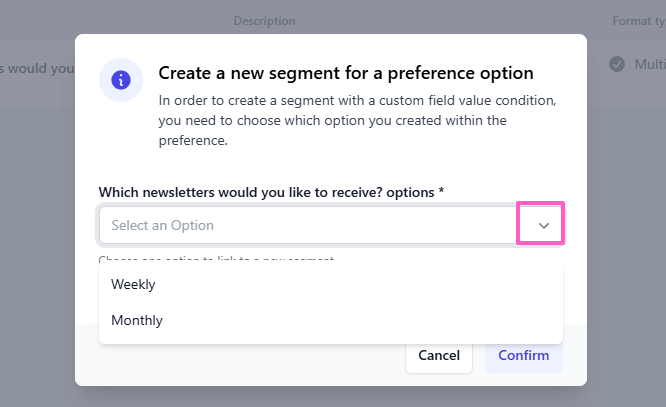 To create a segment based on a custom field from a preference, click the 3 dots menu next to the preference and select Create Segment. Choose the custom field you want to use for the segment. Once created, you can view and manage the segment by going to Audience > Segments.