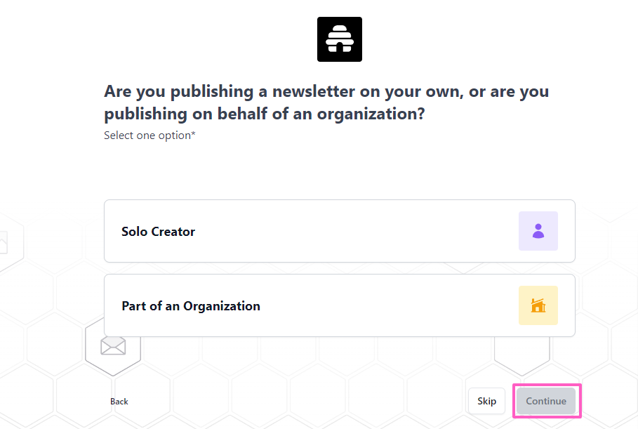 - You’ll be asked whether you are publishing a newsletter independently or on behalf of an organization. Make your selection and click Continue. The next questions will vary depending on your choice.