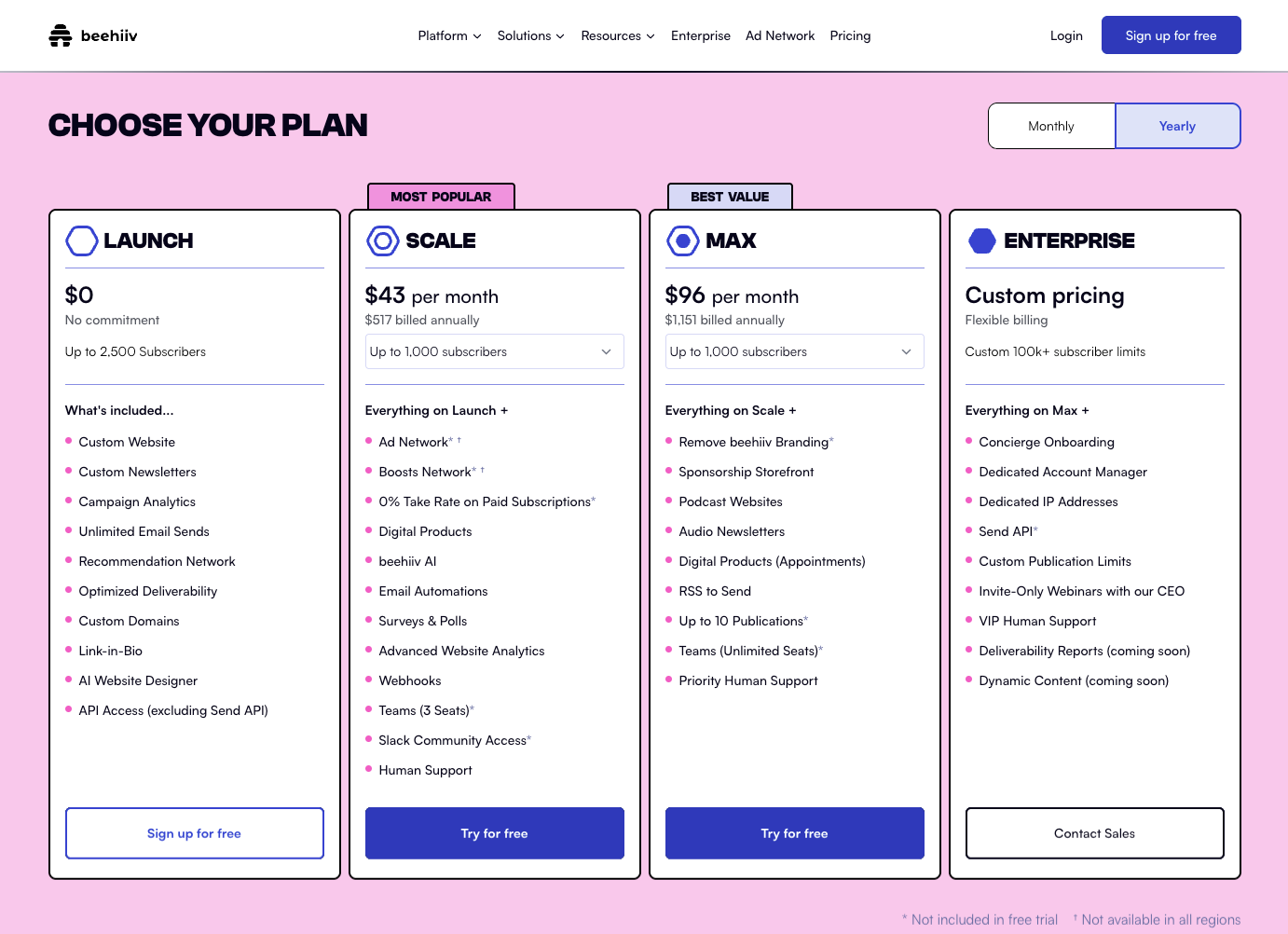 Tech Note: The 14-day free trial of the Max plan does not require a credit card. Trials end upon upgrading to a paid subscription. If you choose not to upgrade at the end of your trial, you will lose access to the features available during that period. Please note that while you can access select paid plan features during your free trial, you remain subscribed to our Launch plan and are subject to its respective limits. - Once you've made your selection, you'll be directed to a page where you can create your beehiiv account. Please enter your first and last names in the designated fields.