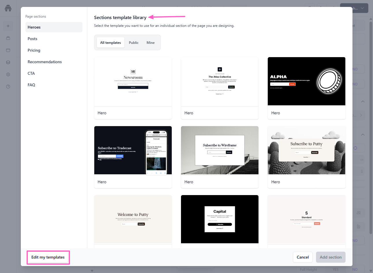 Or, while accessing the Sections template library, you can click on Edit my templates to access and edit templates you saved in the past.