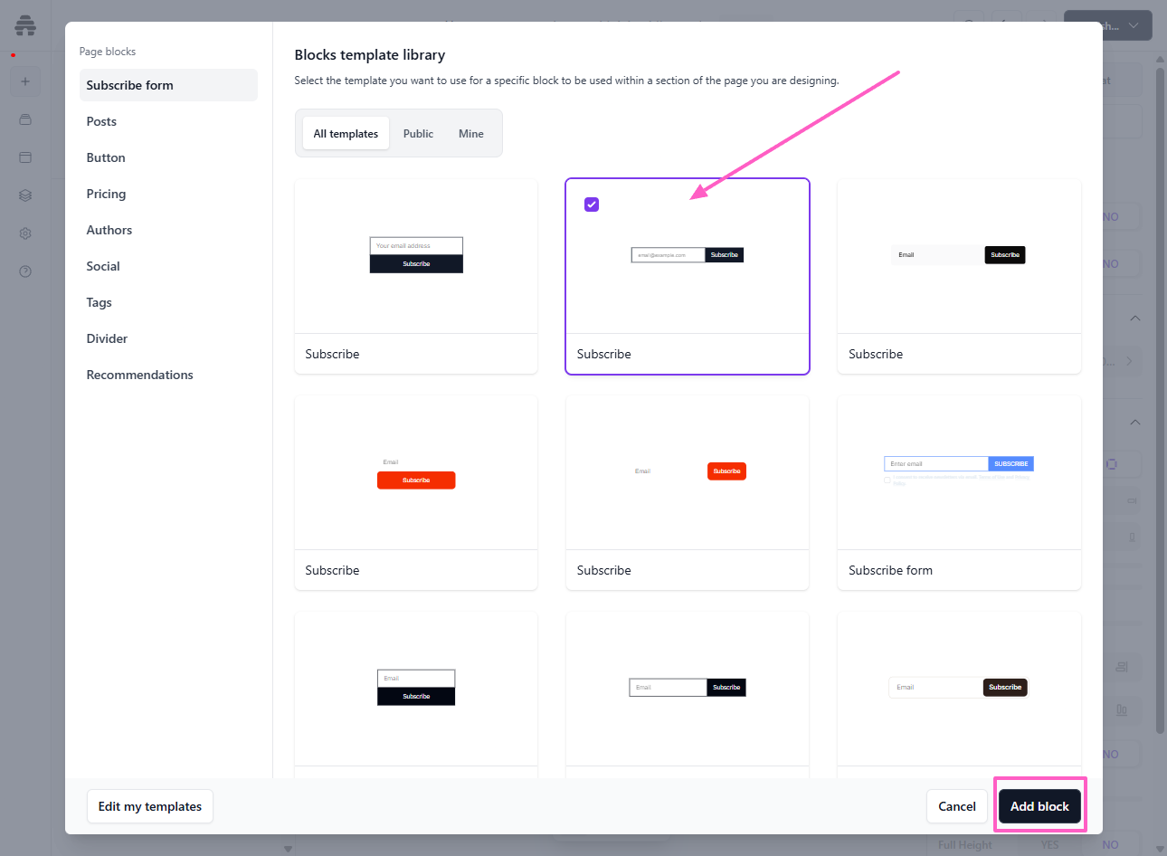 - The Blocks template library modal will appear, displaying a list of available block templates on the left. Click on a block category (e.g., Subscribe form, Posts, Button) and browse through the available template formats.