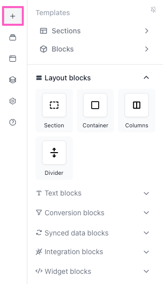 From the icons menu in the left panel, you’ll find the + Insert element option where you can access templates for prebuilt Sections and Blocks, as well as additional block options for Layout, Text, Conversion, Synced data, Integrations, and Widgets.