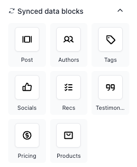 The Blocks option allows you to add individual elements to your page, giving you the flexibility to design and customize your content. Choose from a variety of blocks including Subscribe form, Posts, Buttons, Pricing, Authors, Socials, Tags, Testimonials, Dividers, and Recommendations.