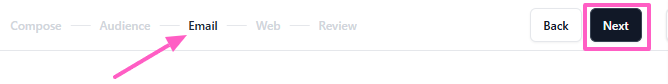 Pro Tip: If you prefer to jump straight to the final review, click the Review tab now and skip to Step 6. - On the Audience page, choose who will receive your post for both Email and Web. Once your audience selections are set, click Next.
