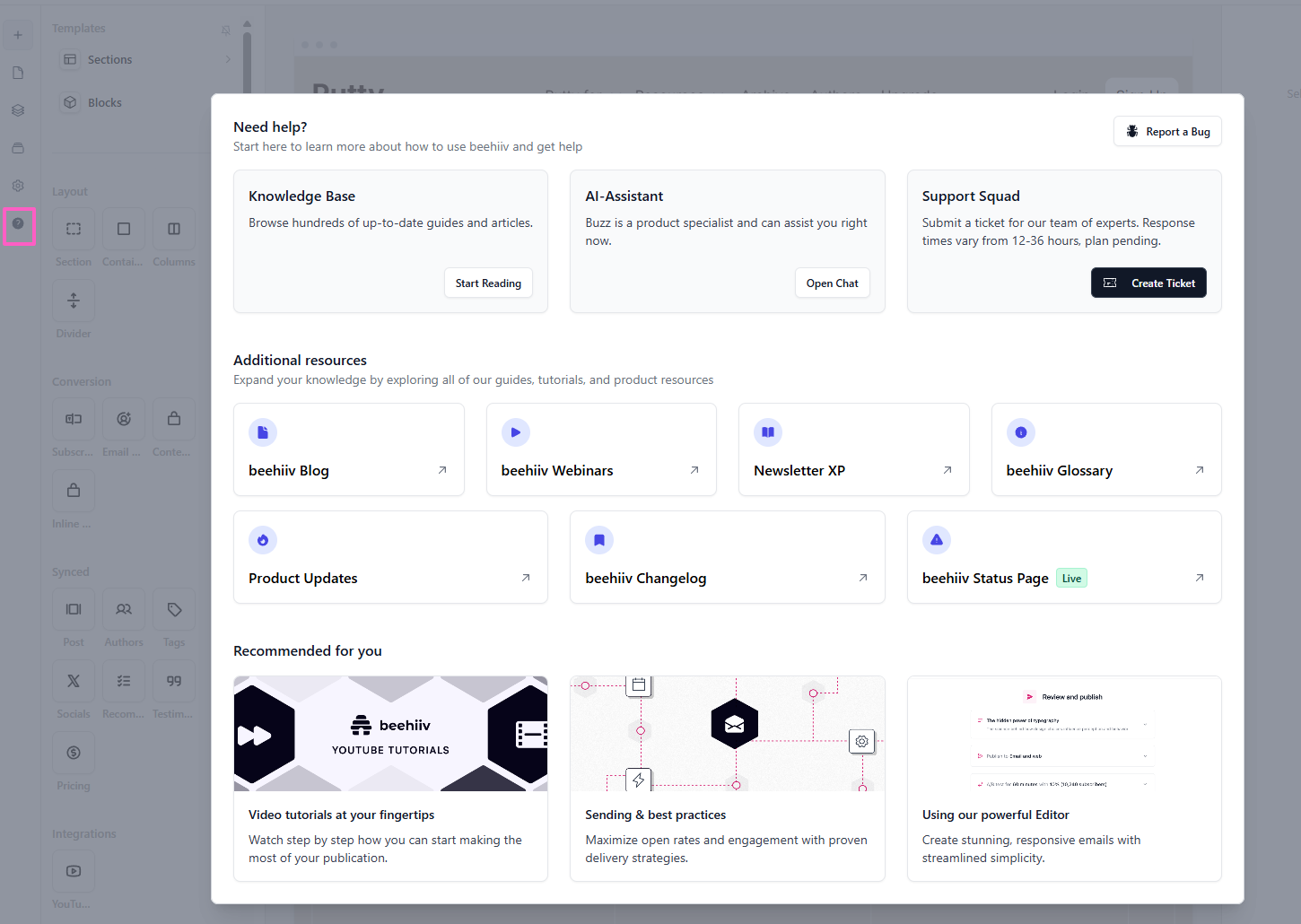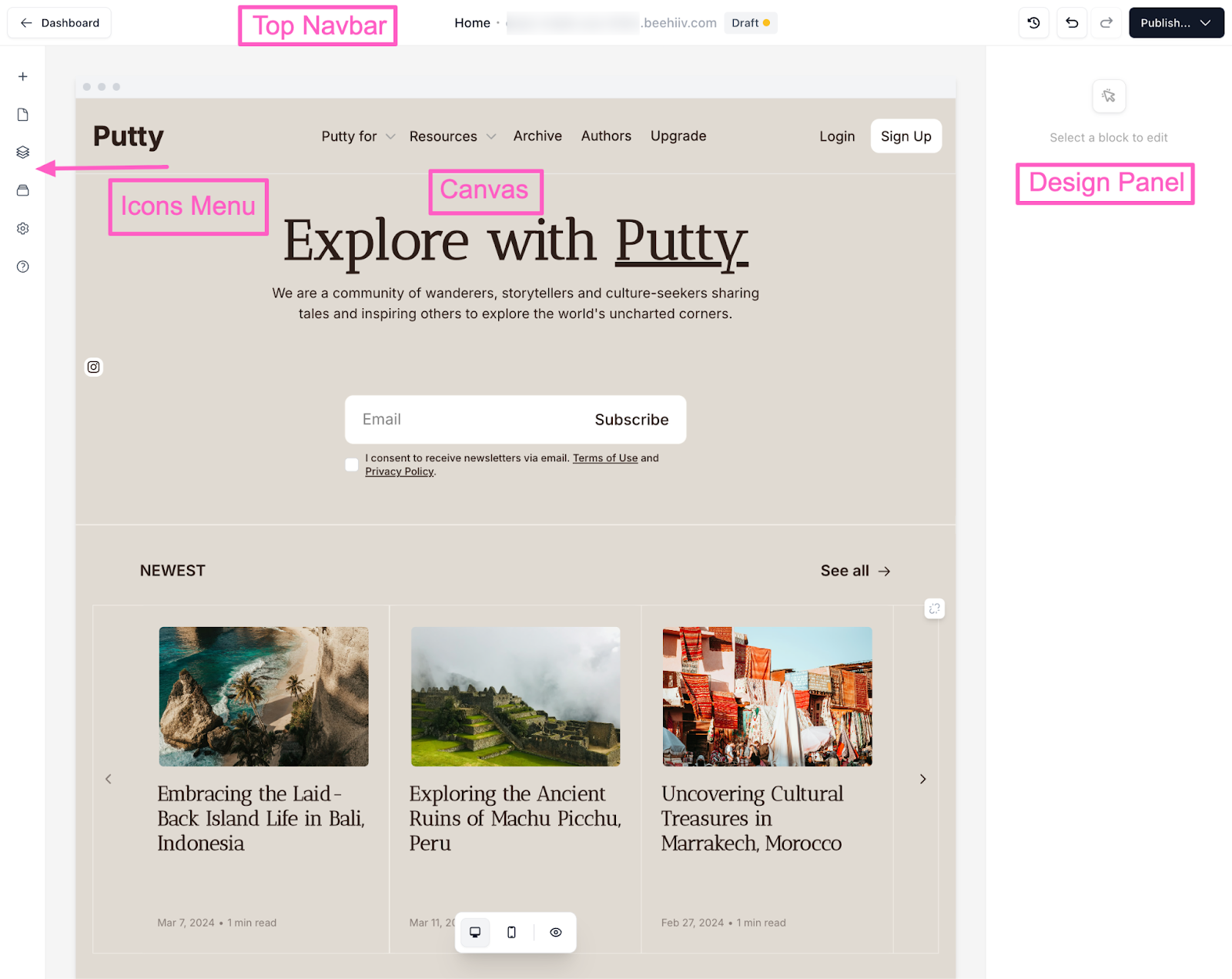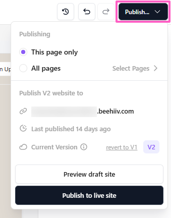 - Dashboard button: Exit the Website Builder and return to your beehiiv account dashboard.