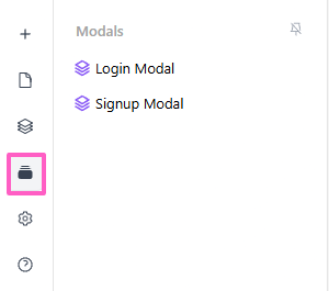 Modals: Use this tab to access built-in site modals for Login and Signup, which can be linked throughout your site. To edit a modal, click to select it. Then use the design panel on the right to configure when and where the modal appears across your site.