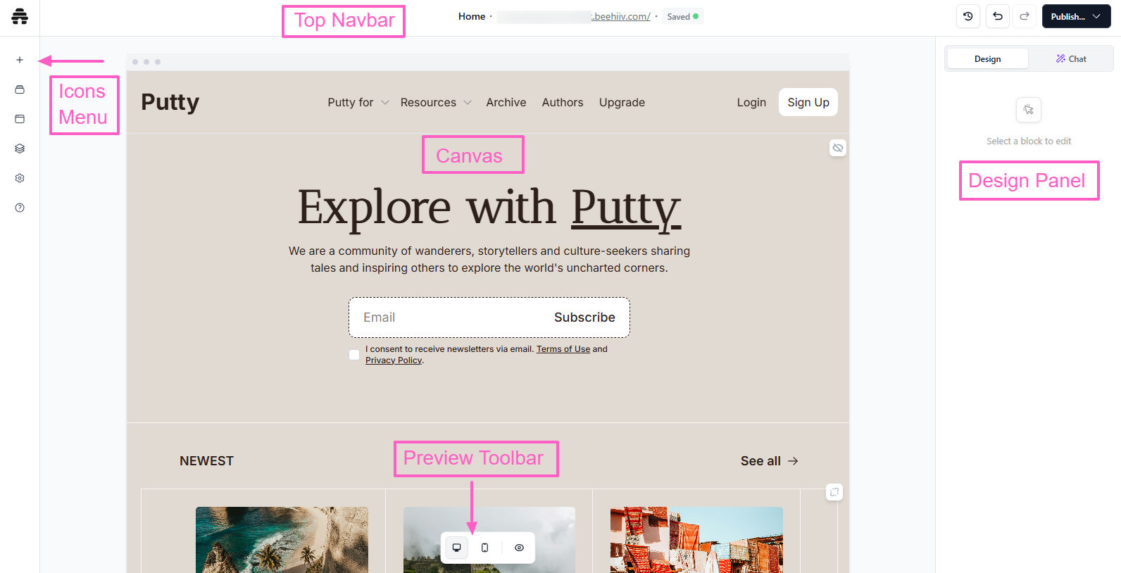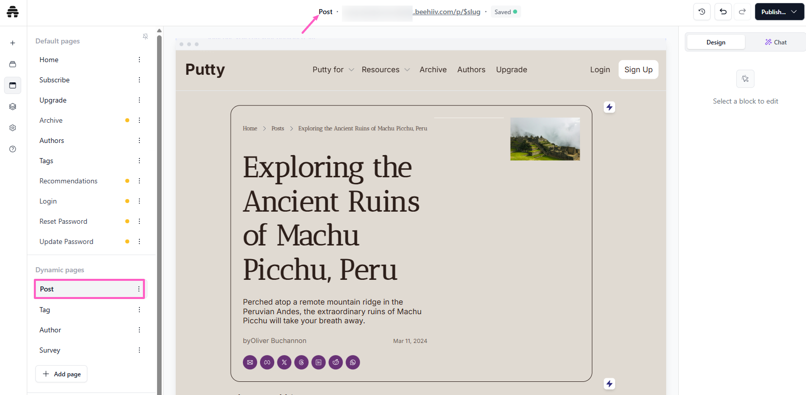 For example, the Post page uses a Post block to render your newsletter content. To customize the appearance of a dynamic page, select its block on the canvas and use the design panel on the right to adjust styling.