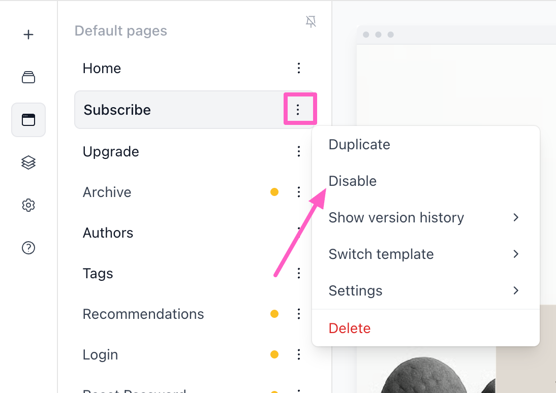 Next to each page, you can open the 3 dots menu to expand your options. From here, you can duplicate or disable pages, switch to a different site template, and access other options like the page-specific version history.